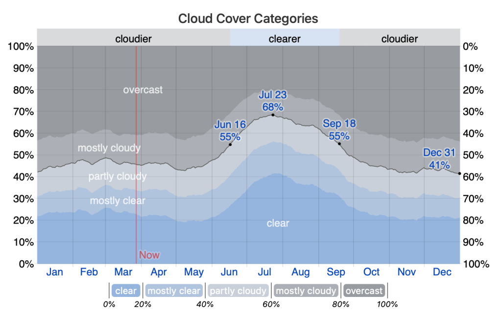 Yearly cloud cover for a smallish city (200k inhabitants) at mid-Northern latitudes. Far from ideal.