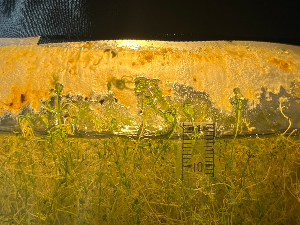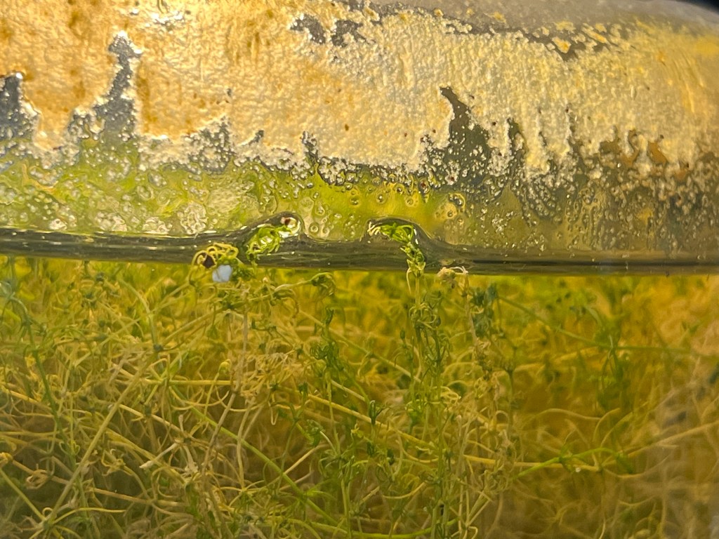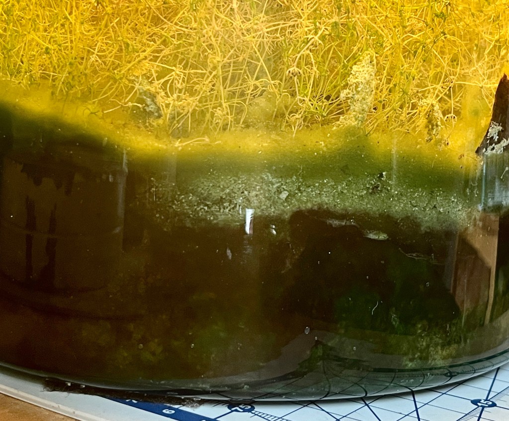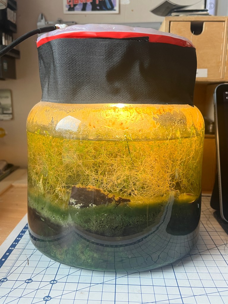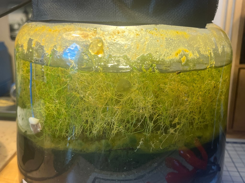 The jar has been completely filled with some sort of algae / water weed that seems to be thriving in almost constant light and steady 22-24°C temperatures. It fills the whole volume of water.