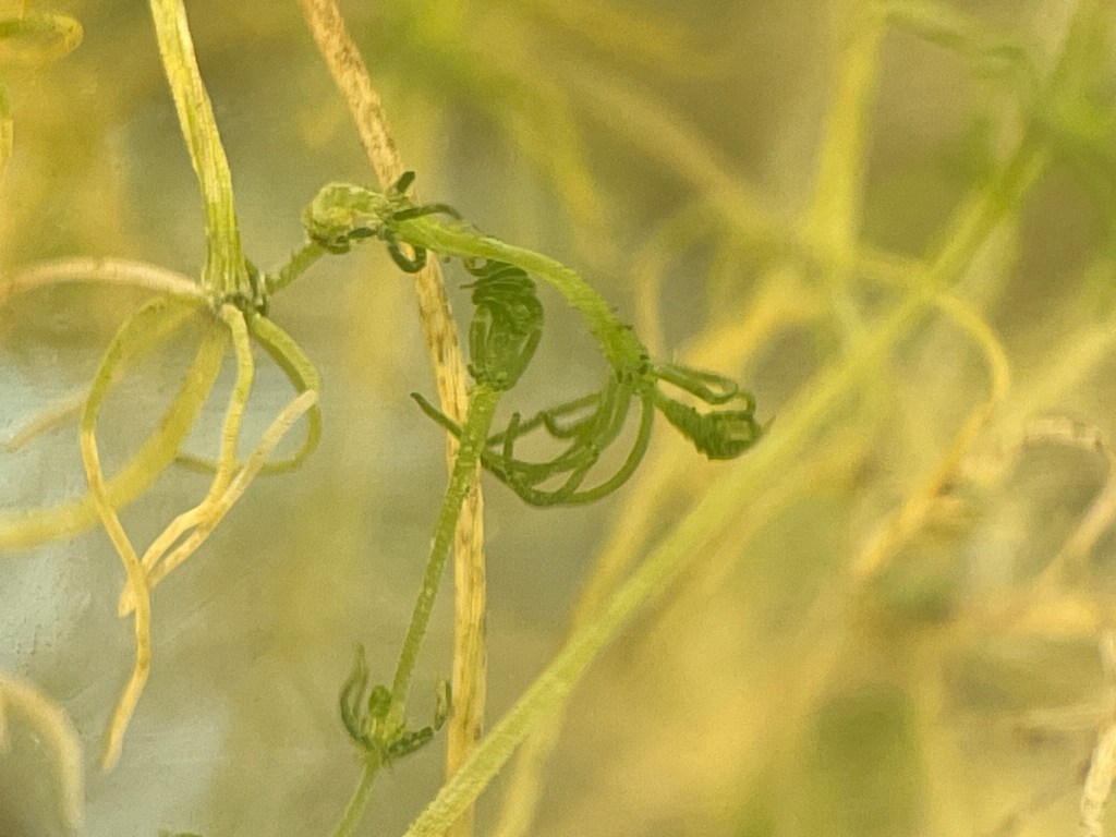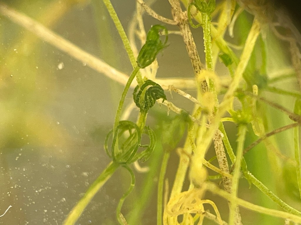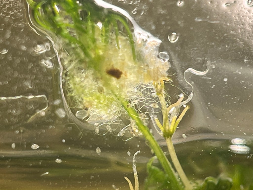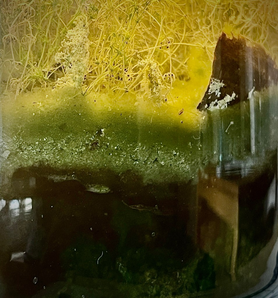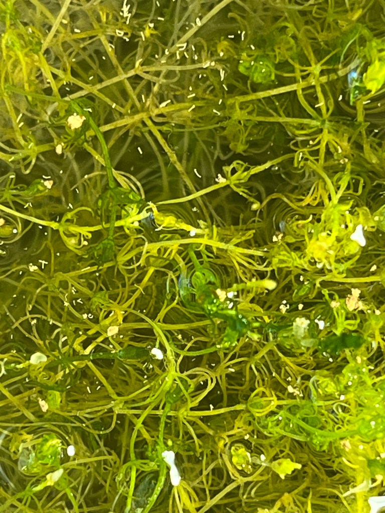The jar has been completely filled with some sort of algae / water weed that seems to be thriving in almost constant light and steady 22-24°C temperatures. It fills the whole volume of water.