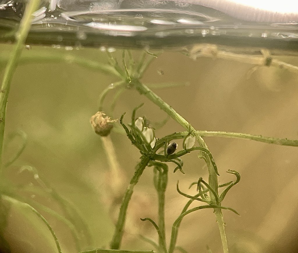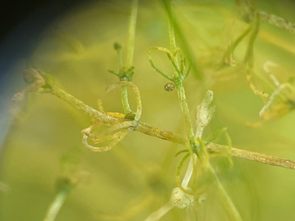 Looking through a magnifying glass (a 30mm 1.4 objective) I saw the ever-present uncontested masters of the swamp – the spotted ostracods – as well as those reddish-brown bugs that I’d seen before and resemble ticks. I was glad to see cyclops buzzing around and there are also nematodes.
