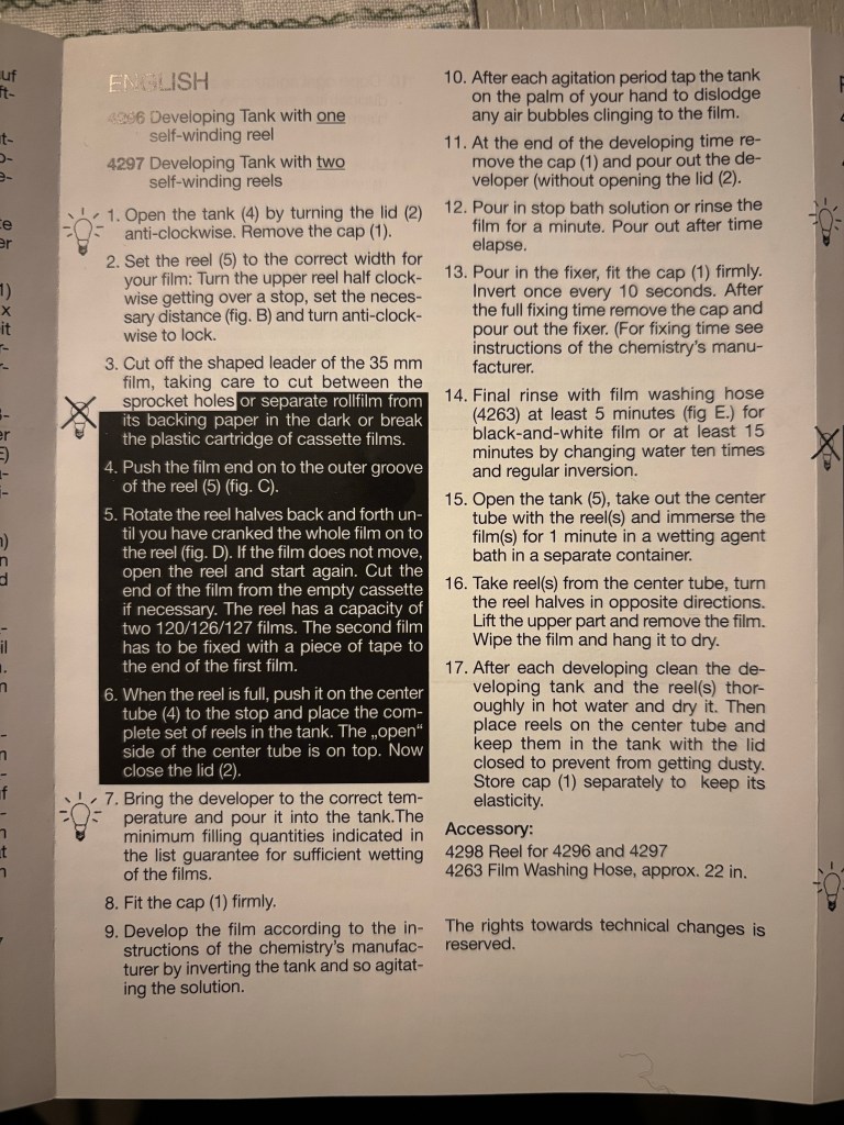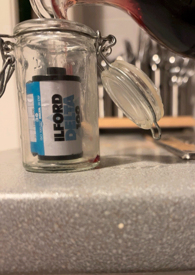 It’s fun. And pretty fast. The film is developed in a solution of developer and water for a set number of minutes at a given temperature. An application told me that Earl Grey ISO 100 needs 35ml of Isofol 3 developer and 315ml of water at 20 C for 6 minutes. You agitate the drum for the first minute, then for 10 seconds each following 5 minutes.
