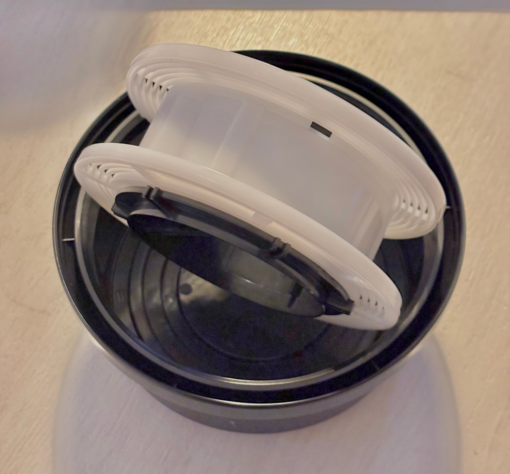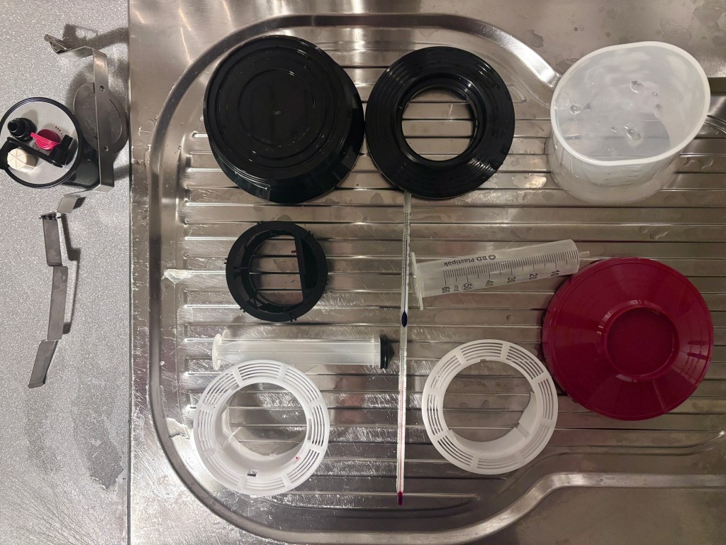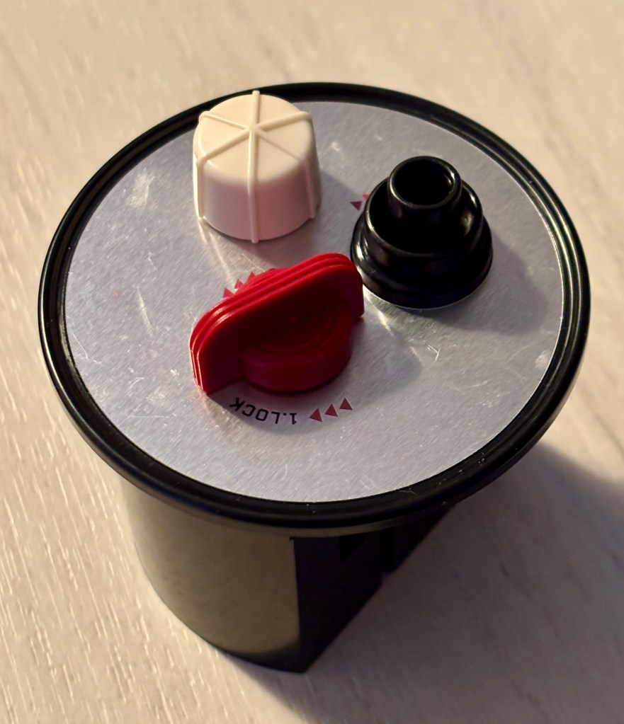 After (hopefully) transferring all the film onto the drum cylinder, the feeding mechanism is removed to allow 350ml of the chemicals of your choice.