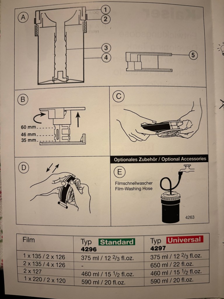 The König Universal Development Tank is a device that removes the need for a darkroom when developing film. It consists of two adjustable rolls (35, 46 and 60mm), of a central axis on which the rolls are placed and all this goes into the development tank that is sealed with a screw-on cap that allows for liquid exchange and the sealing cap that keeps it all in when agitating by inversion. One needs to buy a changing bag in which the film is transferred from the cassette to the rolls.