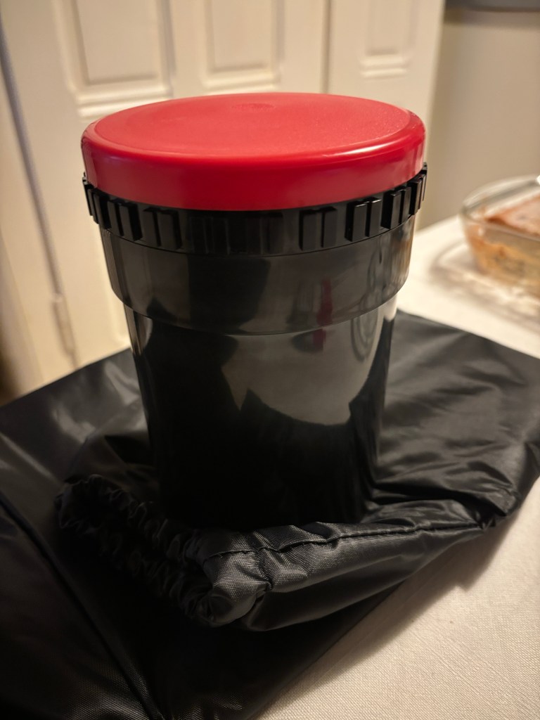 The drum has a metal hinge that secures the lid (it is quite spilly) for the agitation method of developing film. All instructions are printed on the lid, which looks killer.