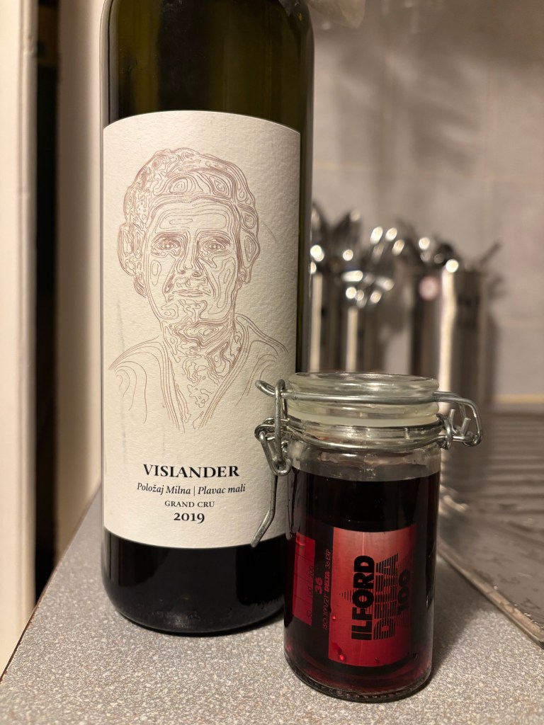 I chose a dark-ish red wine and let the film bathe in it for twenty hours or so at room temperature (22-23°C). The film was fully submerged. The Internet tells me that the alcohol (13-14°) is likely to degrade the emulsion and likely produce explosion-pattern dark spots. The wine will likely stain the film so dots and patches may appear.