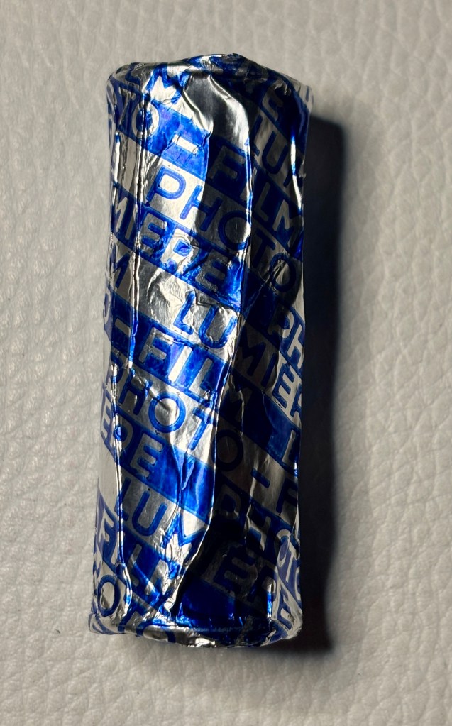 The cardboard box contains a tin tube that holds the film, which is wrapped in aluminium foil. There is also a cotton bag that is used to send the film in and have it developed (the cost was included in the price of the film, according to the information sheet inside).