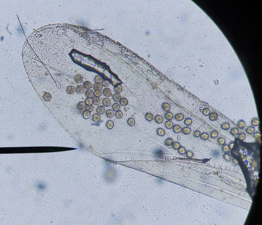 This turned out to be an egg-sack containing a dozen or so eggs, which are very much alive. 400x magnification shows the embryo being composed of several cells, tightly stuck together to form a slow-moving sphere.