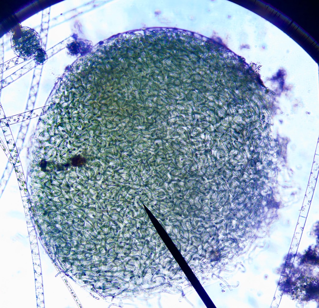 Nematode worms of different sizes are also present, from the smaller, more agitated ones, to the larger, slower ones.