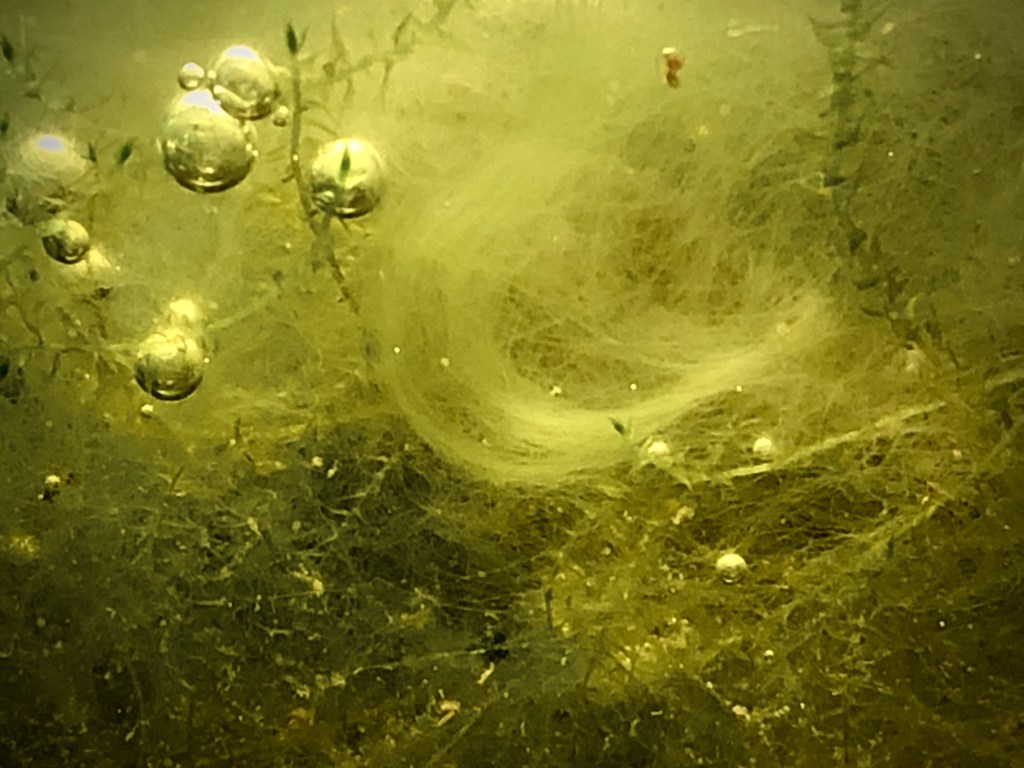 The plants produce significant levels of oxygen, seen in the little bubbles that form among the water plants and algae.