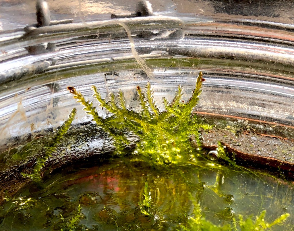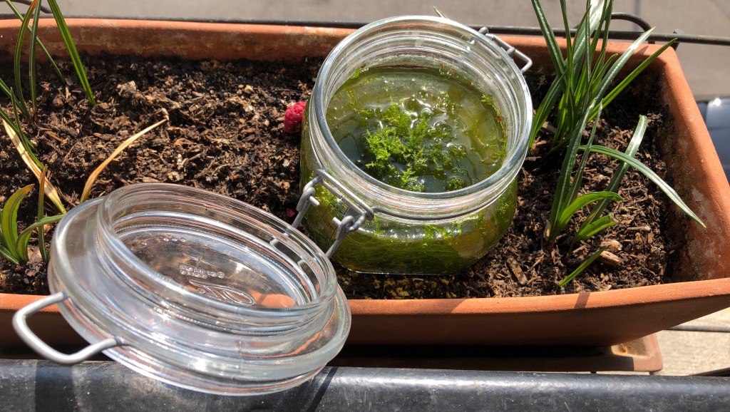 This green moss-looking plant was emerging from the brown dead grass on the shore, so I took a handful with the aim of increasing the oxygen production in my jar swamp. Not sure this will survive given the fact that it’s fully submerged and has little to no soil. In the worst case it will decay and provide nutrients..