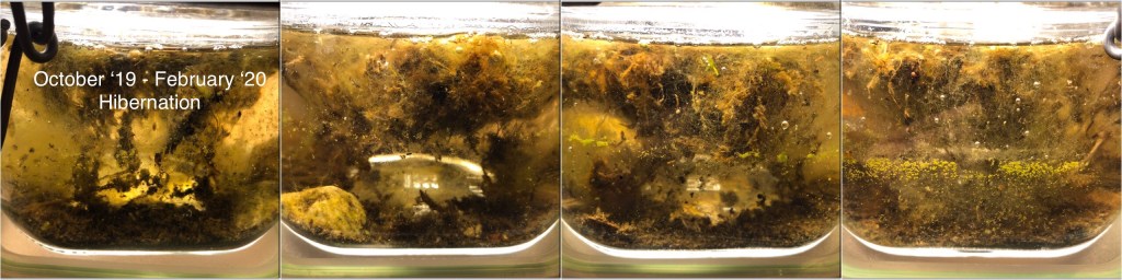 A week later I seeded the jar with fresh (collected in the second week of February 2020) samples from the fishing pond (slime, dirt, water plants, algae) and plans that grew in a fresh water source that I found on the side of a hill.