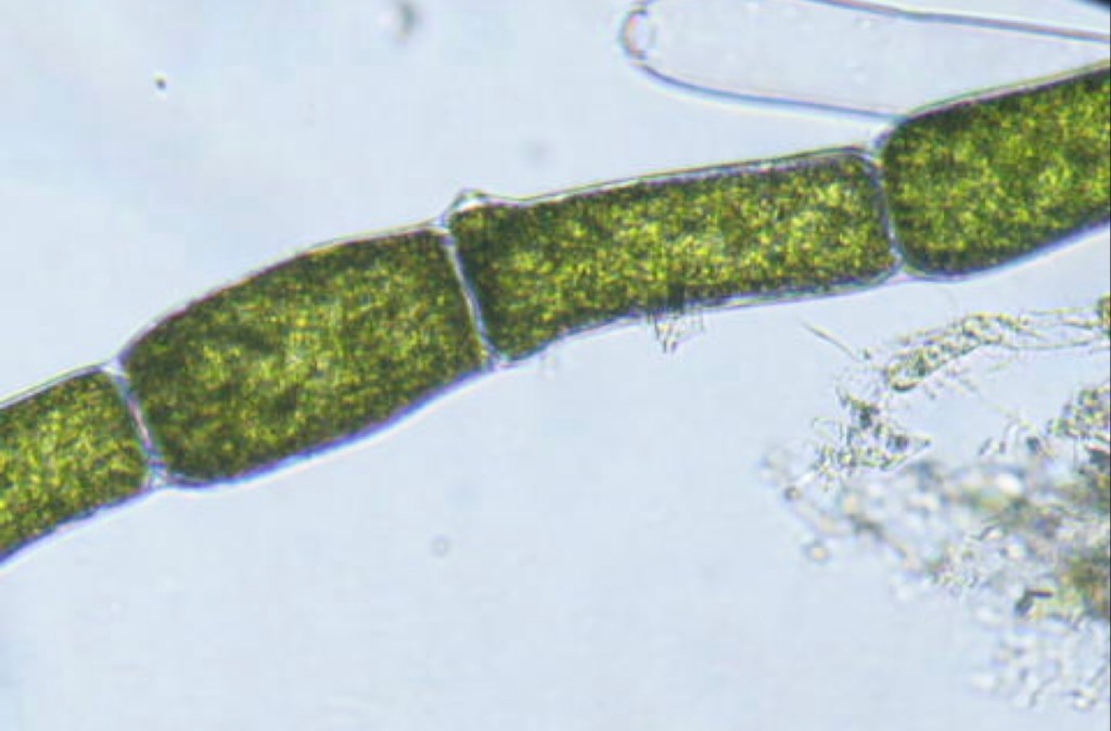 The most abundant of the algae is spirogyra, the very fine tubular algae with their spiral coil of chloroplasts that look like gelatinous mist in the water. I had also noticed segmented algae, somewhat thicker than spirogyra and without the coil, having neatly separated chambers filled with chloroplasts.