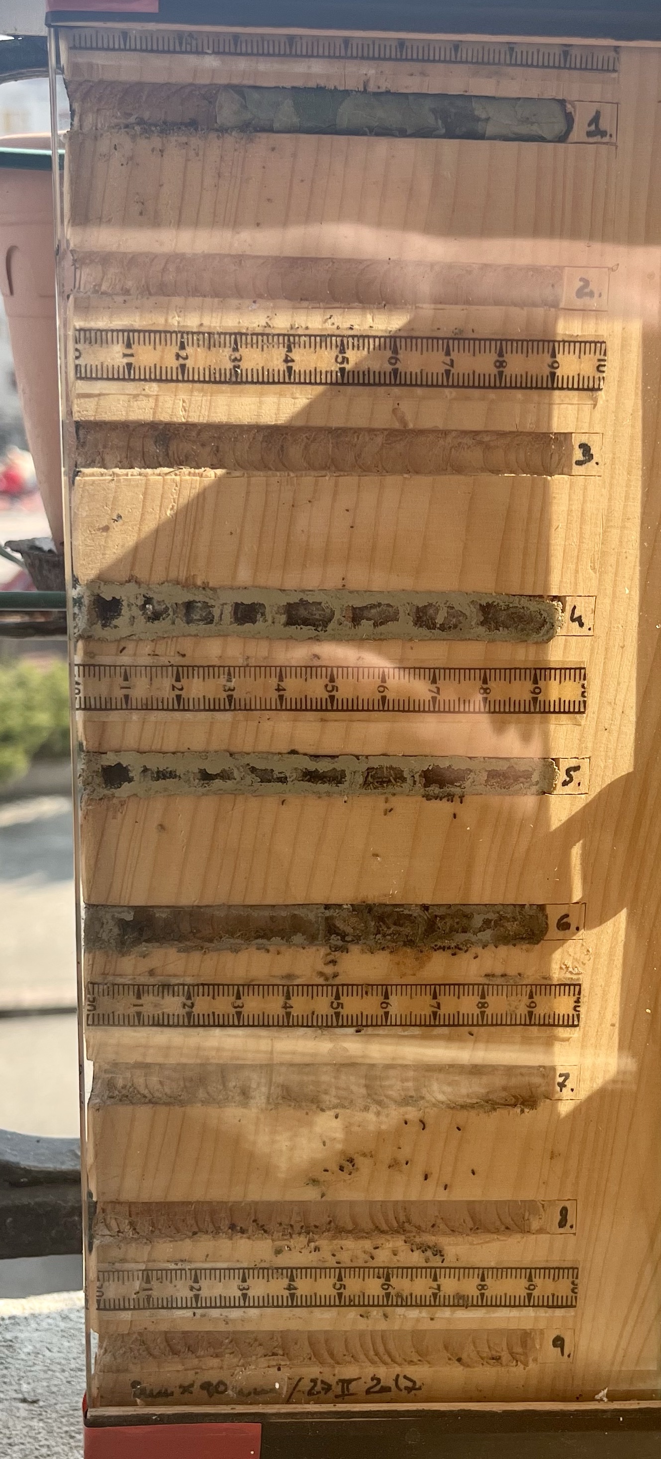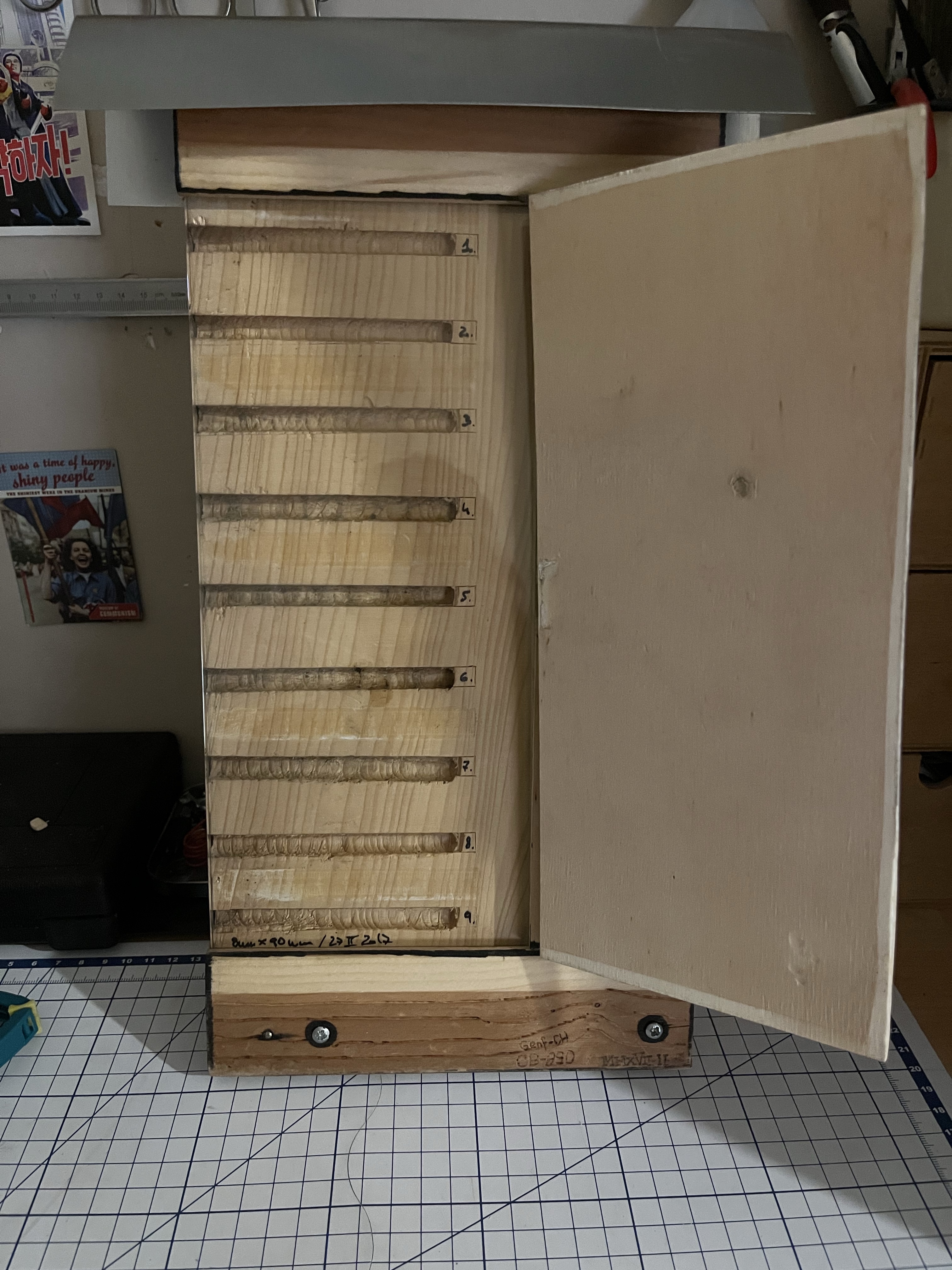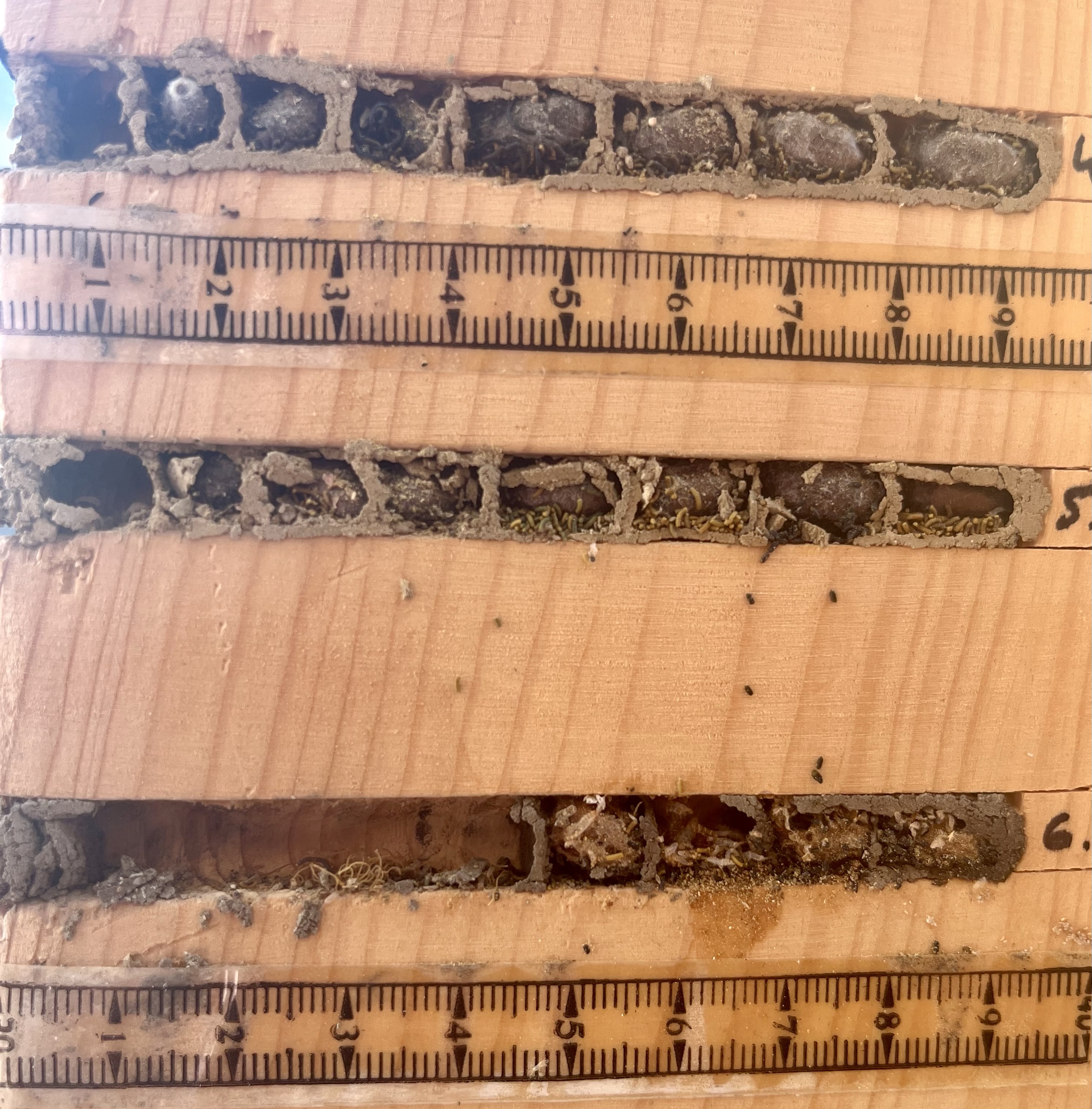 It lies just outside my window, by some flower pots next to the wall (SE) It was populated every year, starting in early spring, with the holes sealed by May. The highest number of holes occupied must have been 5 or 6. Last year (2021) was the lowest so far with only 3 taken.