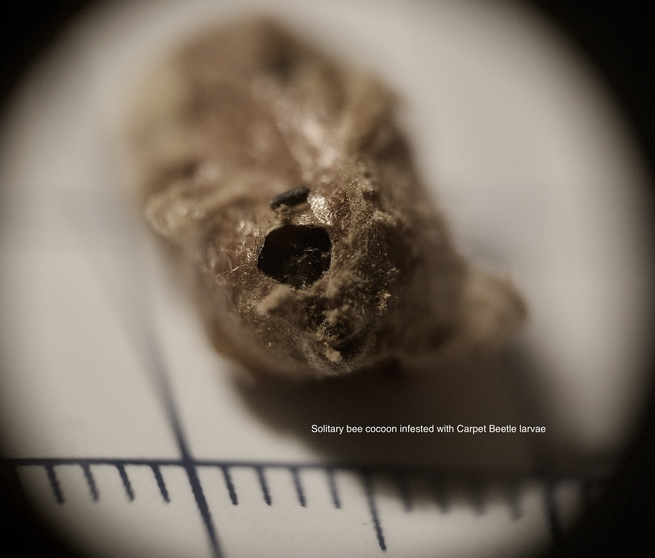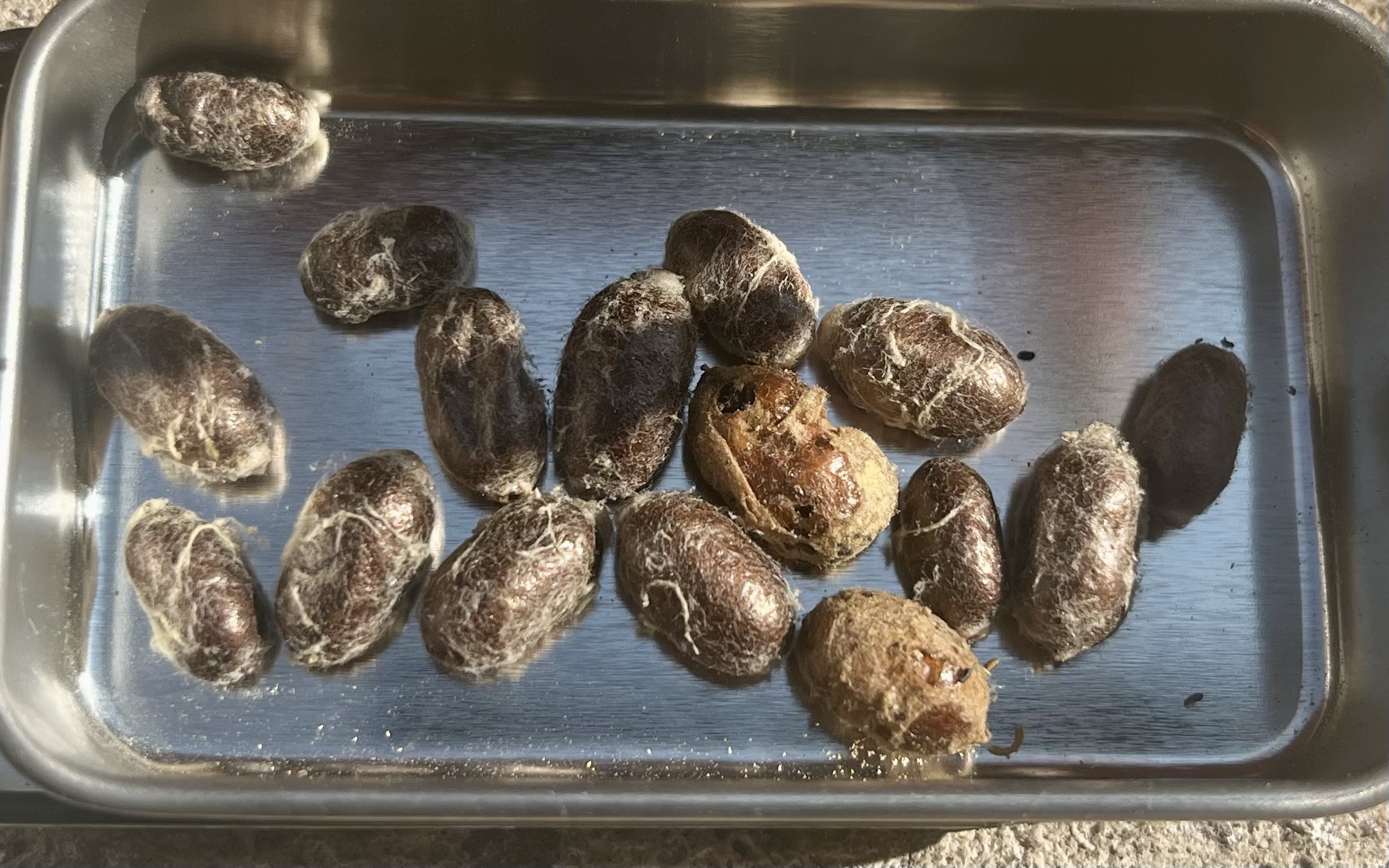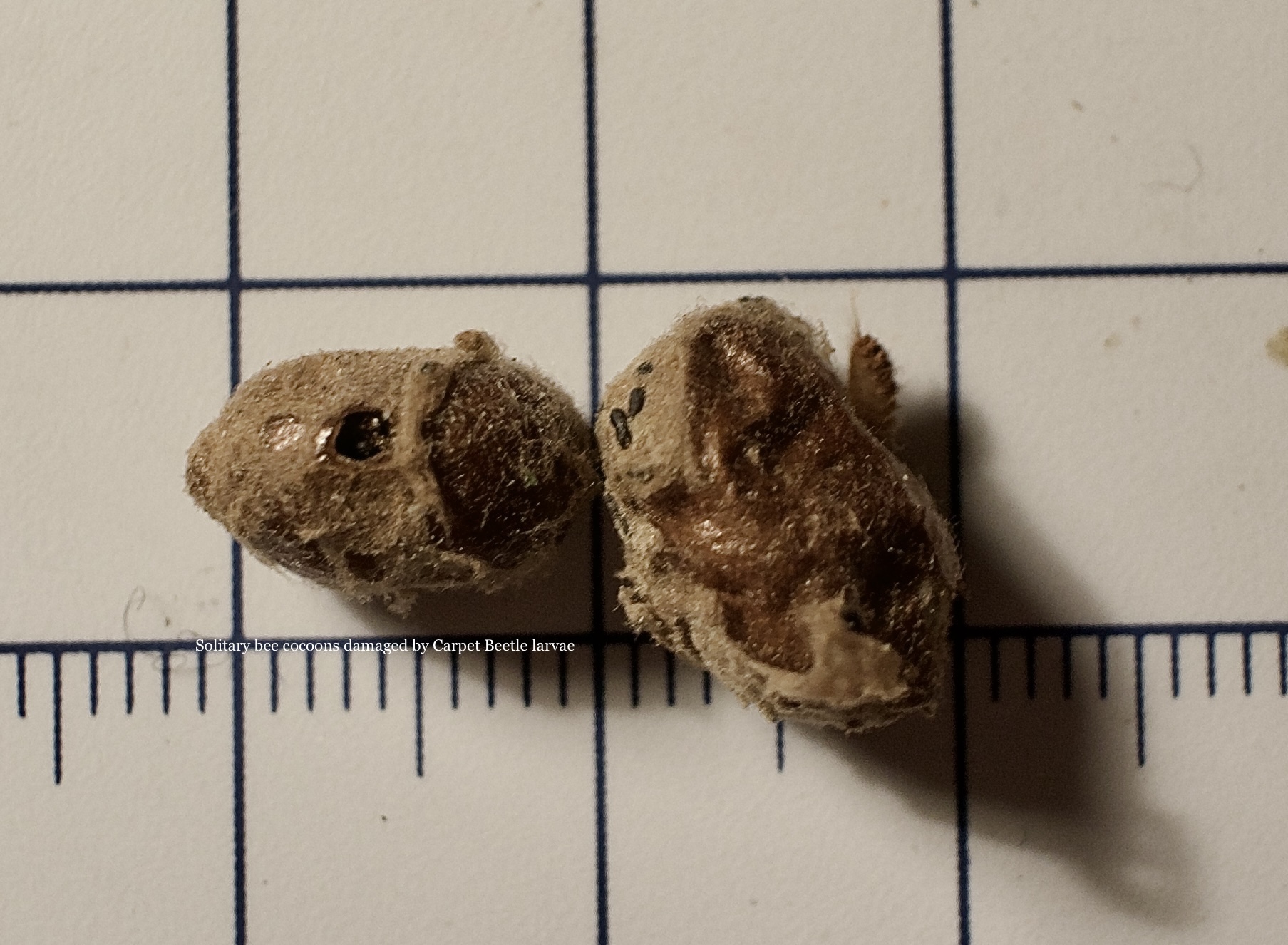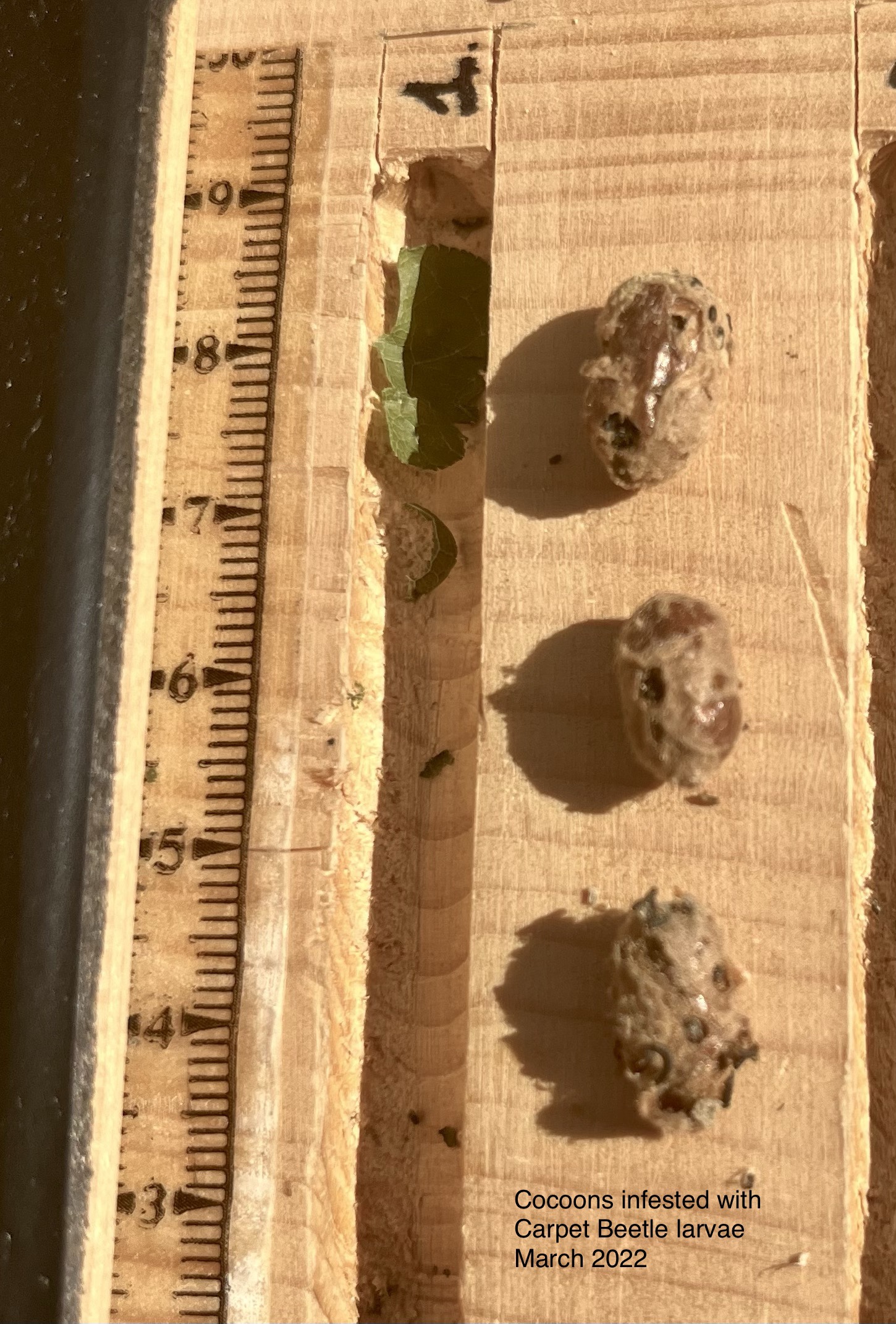 A whole row of cocoons has been killed by the larvae of the Carpet Beetle. They manage to break the cocoon, get inside and feed on the larva.