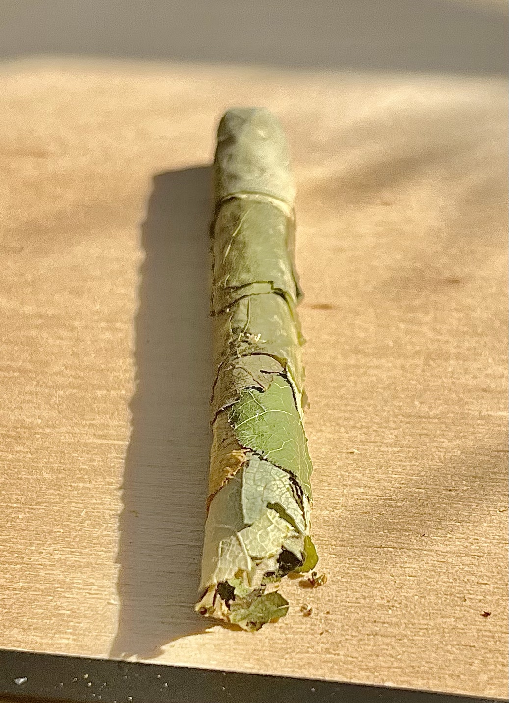 This pretty cigar-looking structure is made by the leaf-cutter bee: