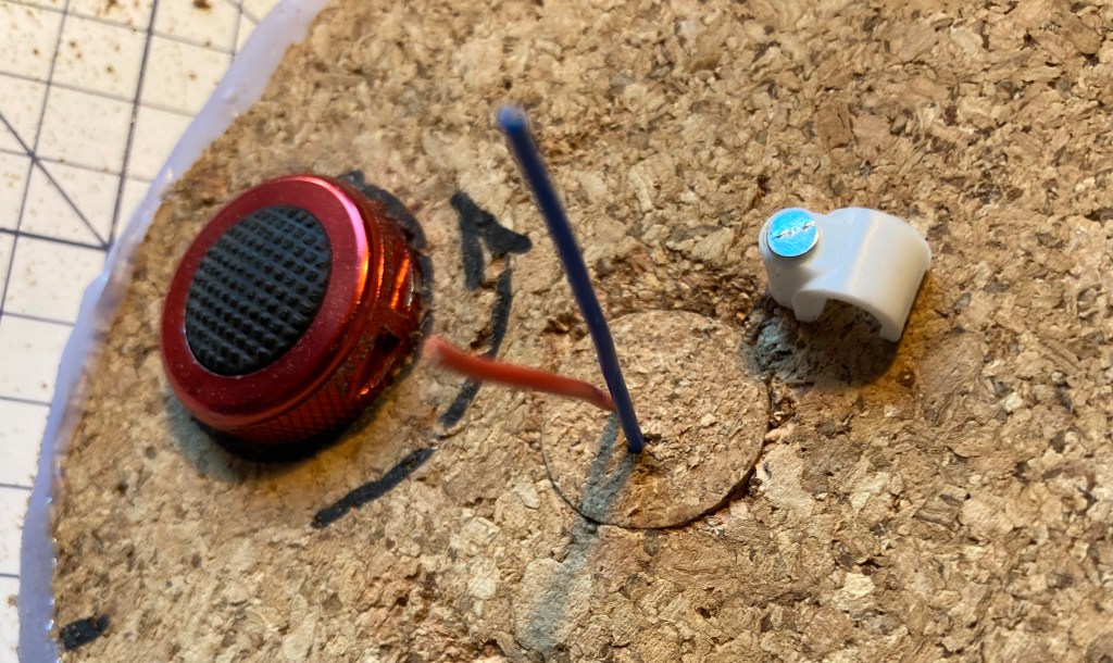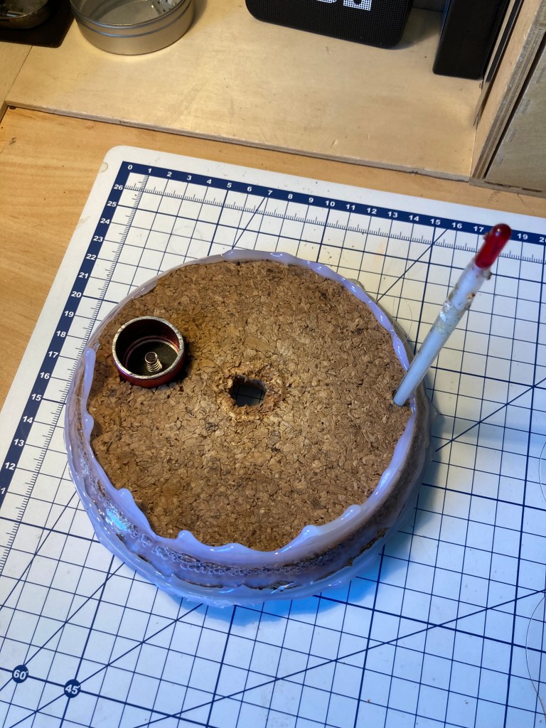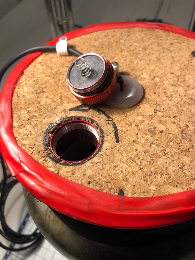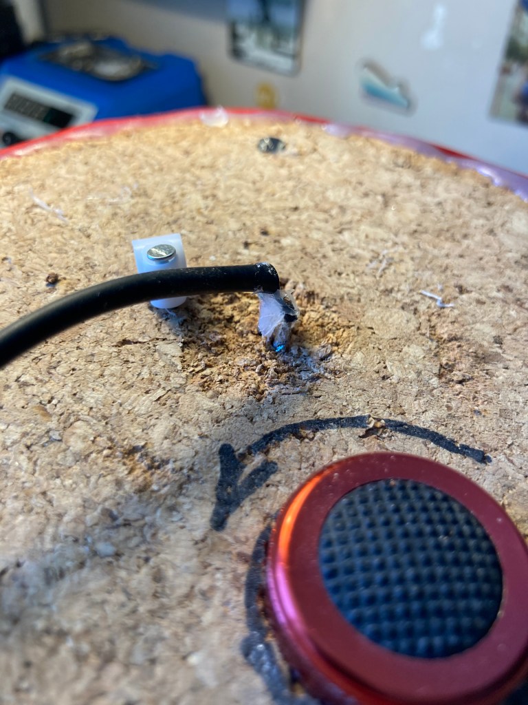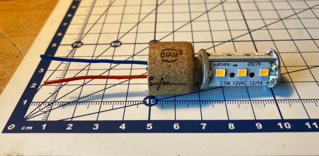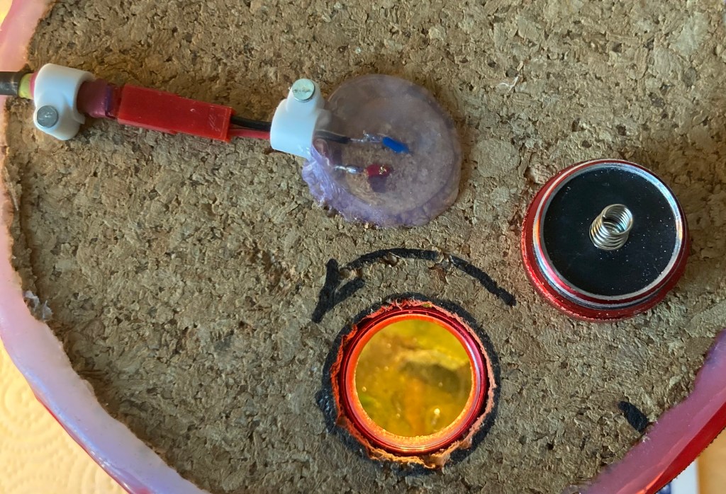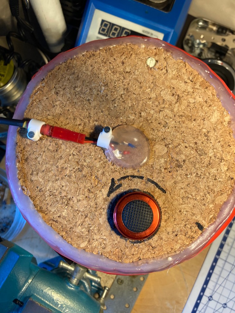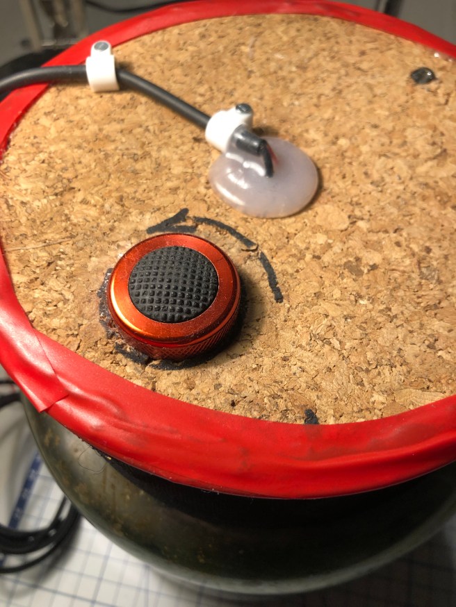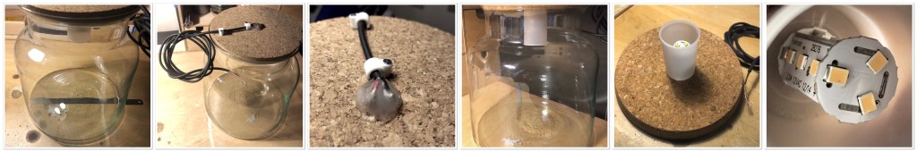 As the lightbulb regularly needs replacing I decided to stick it in a wine cork and allow for replacement without unsealing the main cover of the jar.
