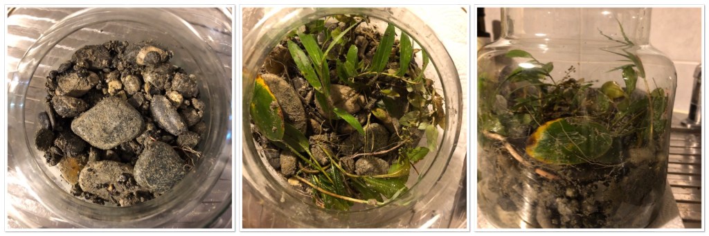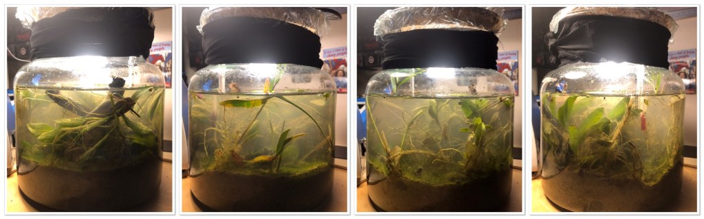 The plants seem to be doing well, although there is much muck on their leaves. Saw some roots in the substrate and also fine strands of algae that seem to be colonising it. They are advancing upwards on the wall of the jar.
