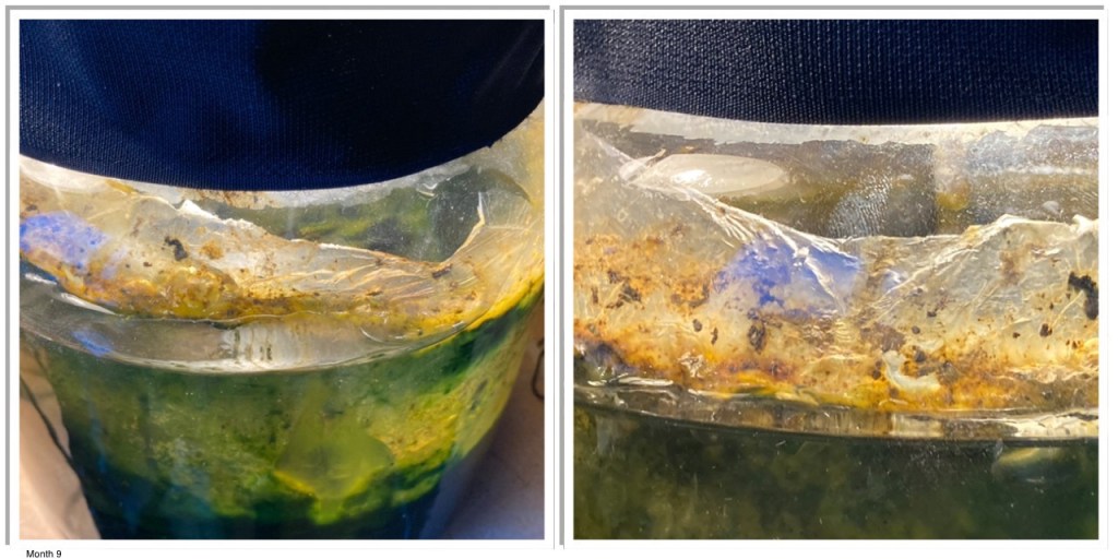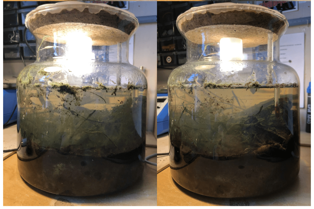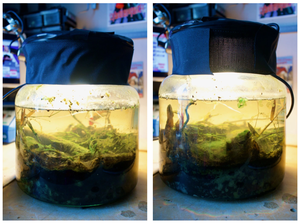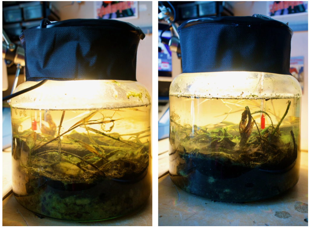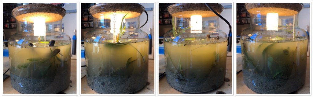 One year on, and there is an abundance of life in the jar, both macro and microscopic. Vegetation is now mostly on the bo ttom, and it largely consists of algae. More algae at and above the water line, on the walls of the jar. The lights have been on for the most part of the last 6 months, with maybe 48h of darkness in total. Temperature has been a steady and warm 22-24°C.