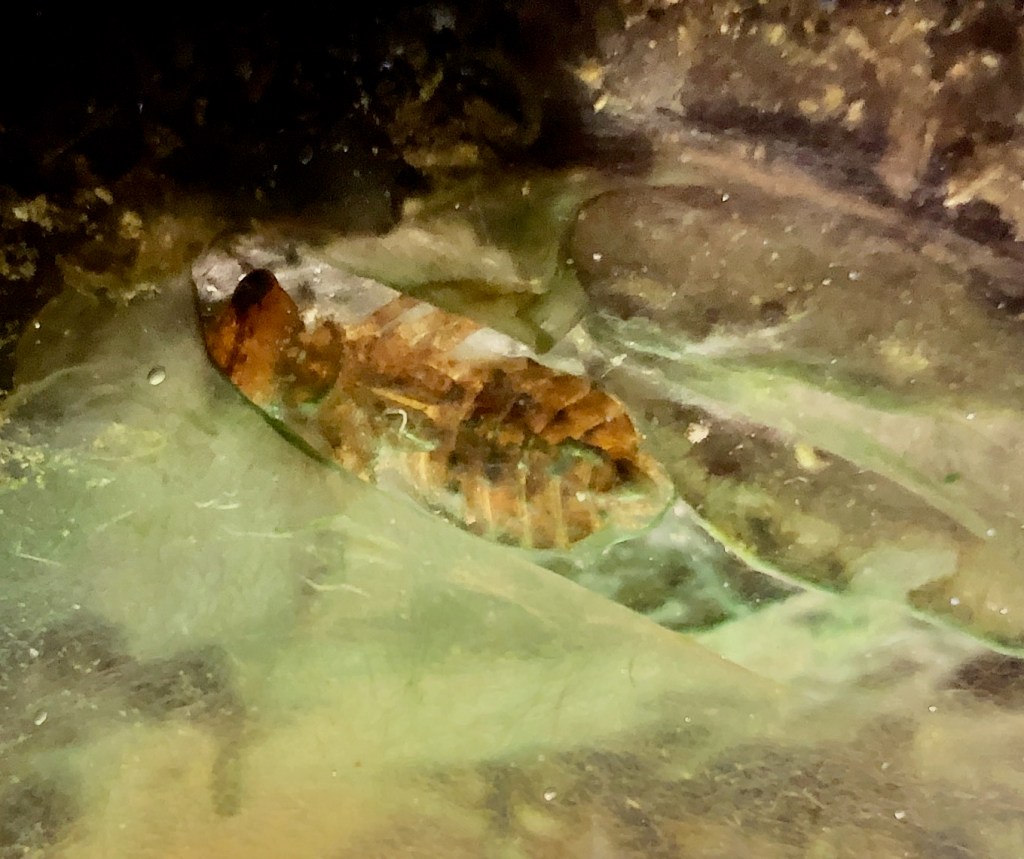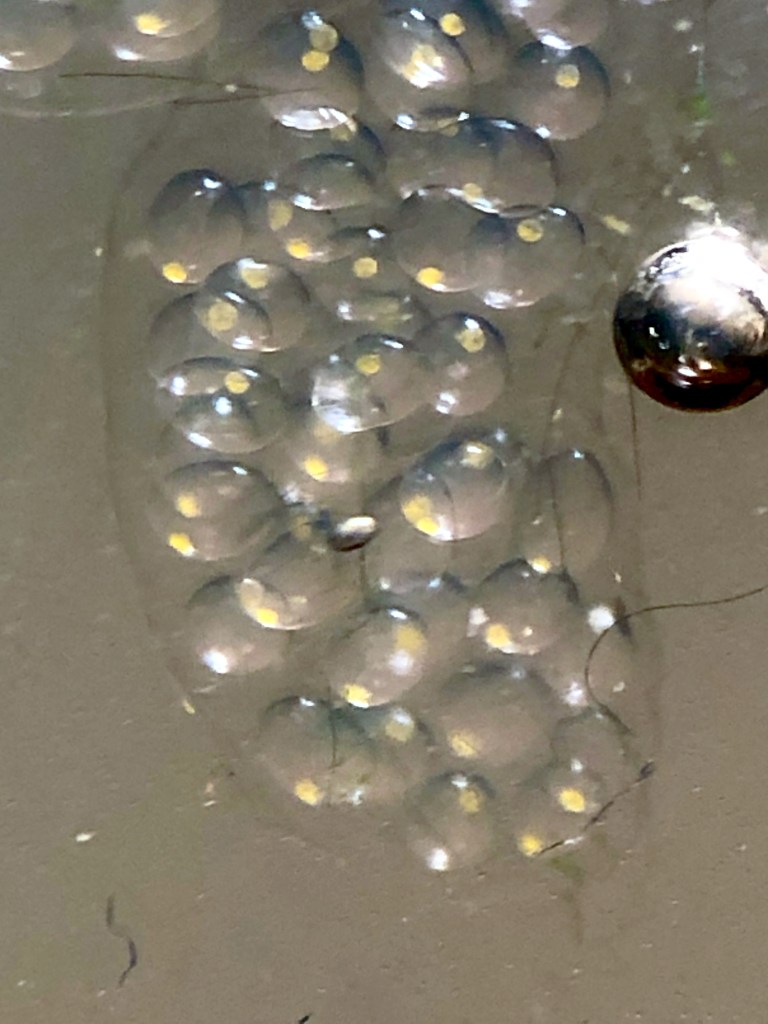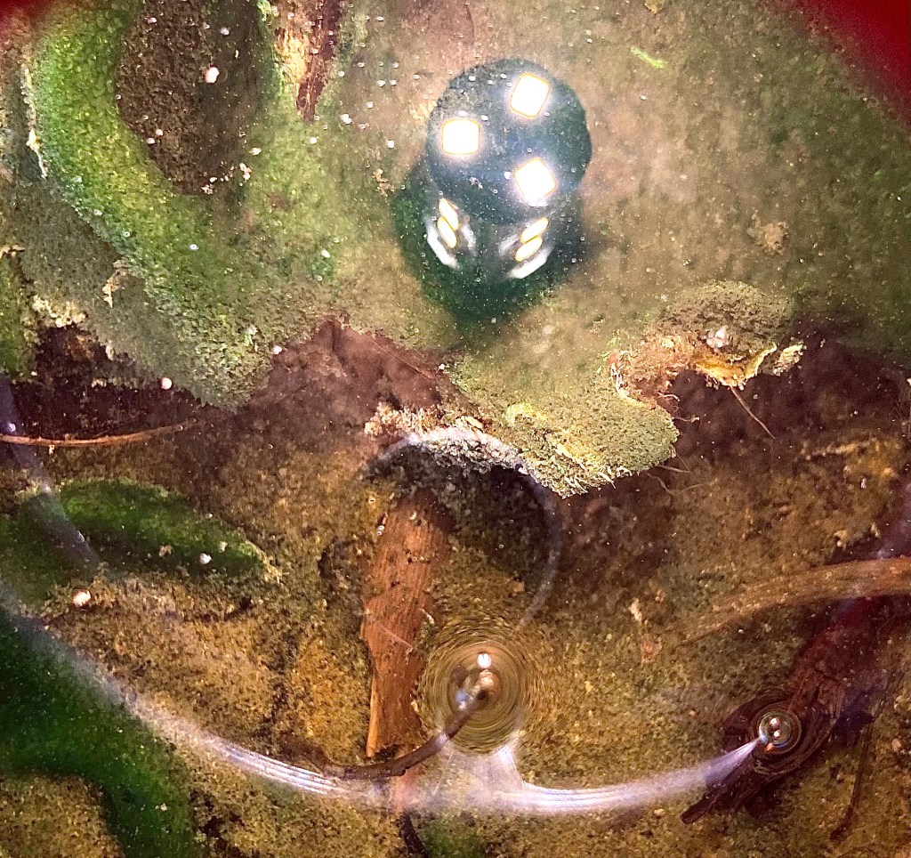 The snail is large 1cm+ and happily wondering around, as are the bubble bugs. Eggs on the stick underwater and on the side of the jar; I suspect the large snail laid them. The algae have all but disappeared from the sides, probably eaten by the snail, as I’ve seen it munch away at them several times. The water is surprisingly clear – I suspect there is not enough light for algae to develop in large numbers. I think the jar *cycled* in the aquarium sense of the term.