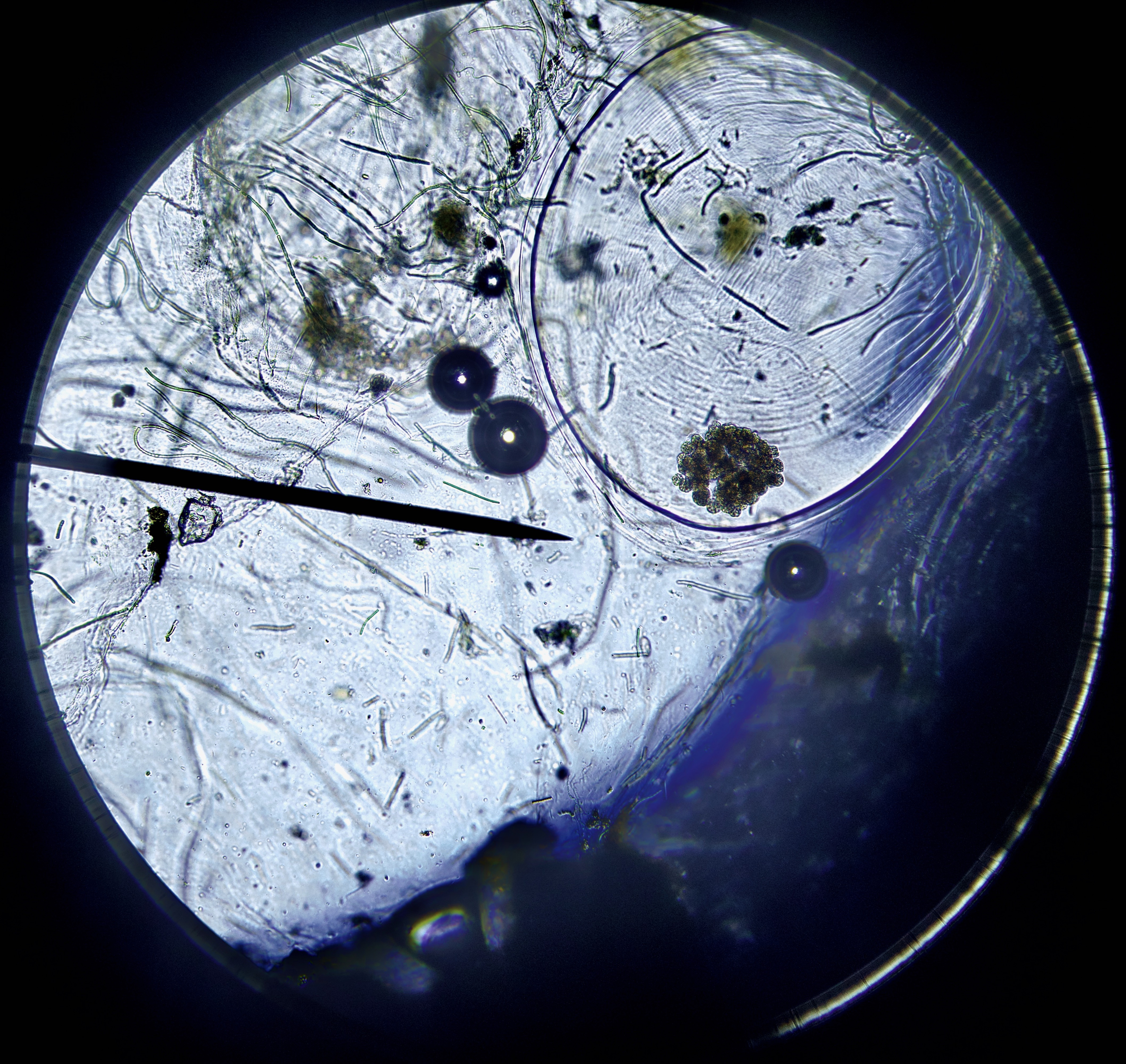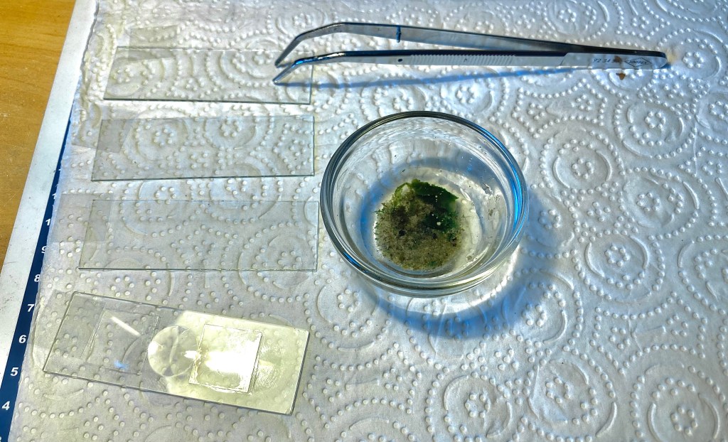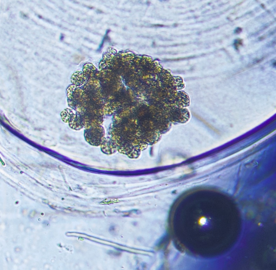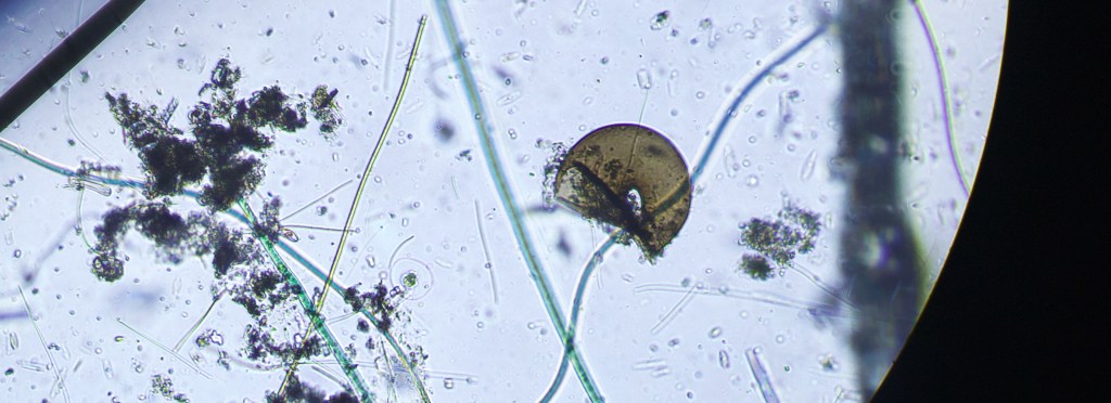 A water sample was collected today from a freshwater flowing lake (particularly clean these days), together with a small clam, algae and muck scraped-off a semi-submerged rock.