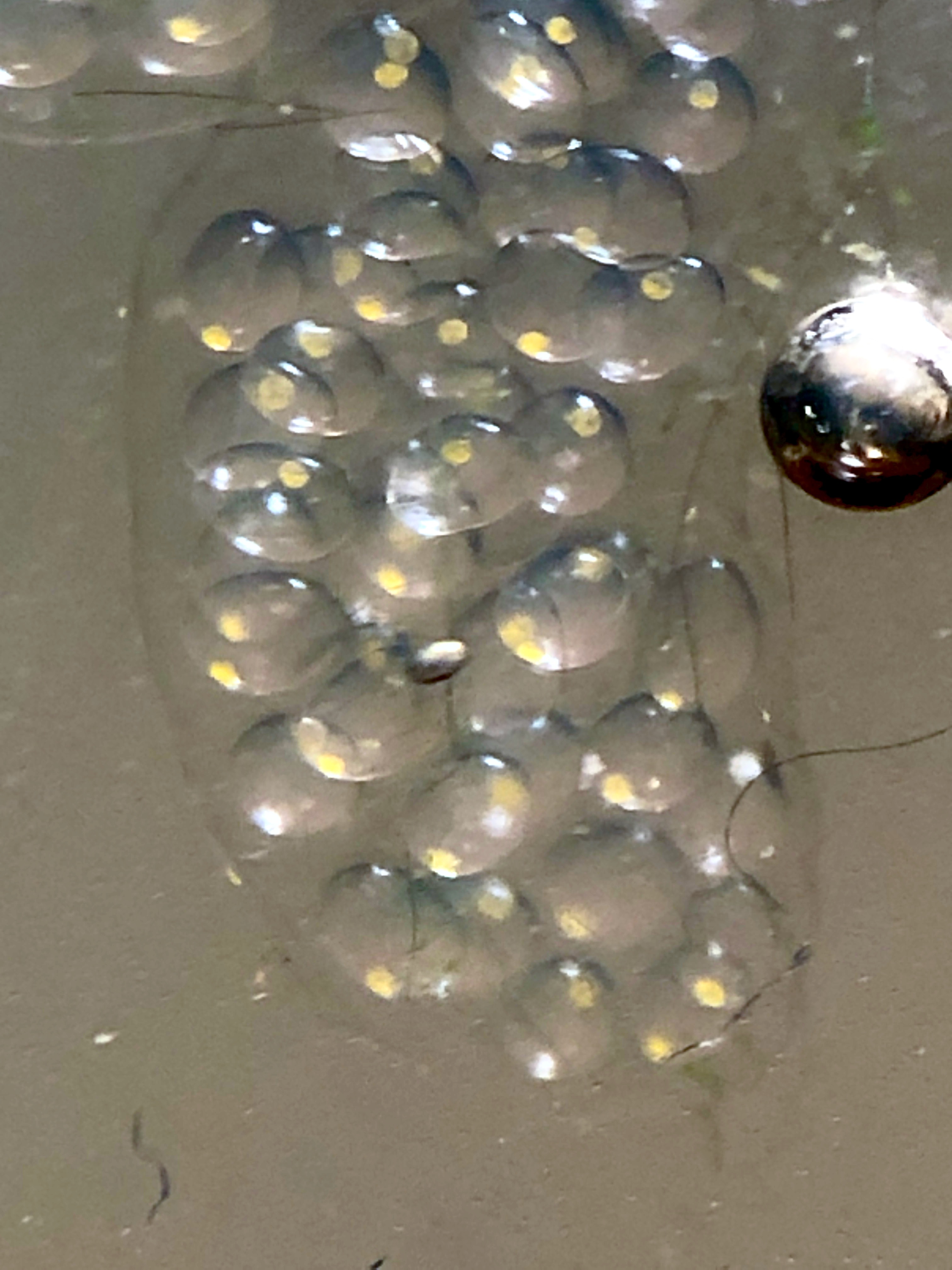 There are more and more eggs, with obvious fresh ones appearing on the sides and on the bottom of the jar. Also new batches on the stick as well. The older ones seem to have been colonised by algae and have become green (picture on the left). The “nucleus” of the egg seems to be an elongated, twisted ribbon that looks pretty much like an intestine. It has not changed since the eggs have been laid. I still suspect the snail.