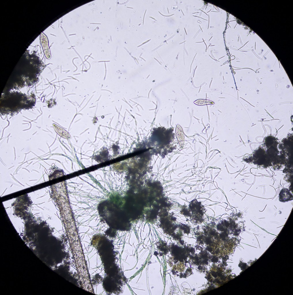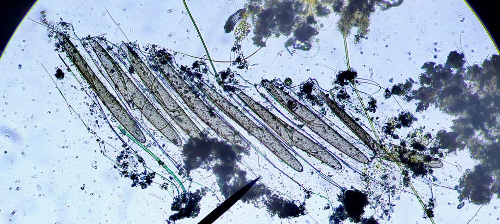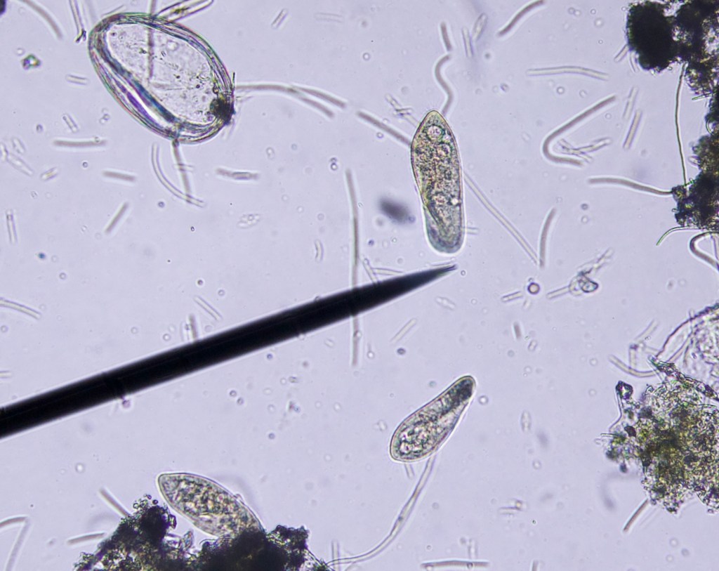 More elusive but equally abundant paramecium. They are particularly active and move very fast through, and out of the field of view. here’s a calmer one: