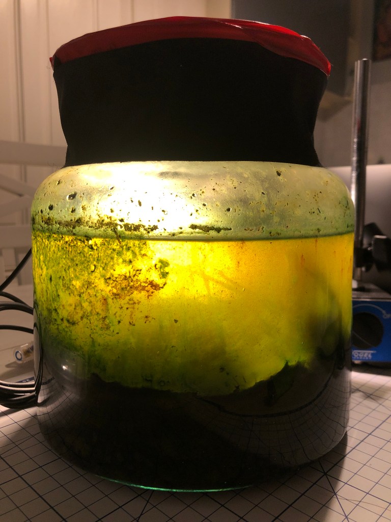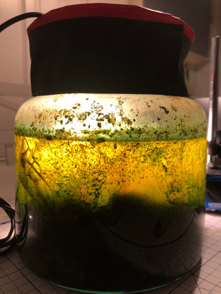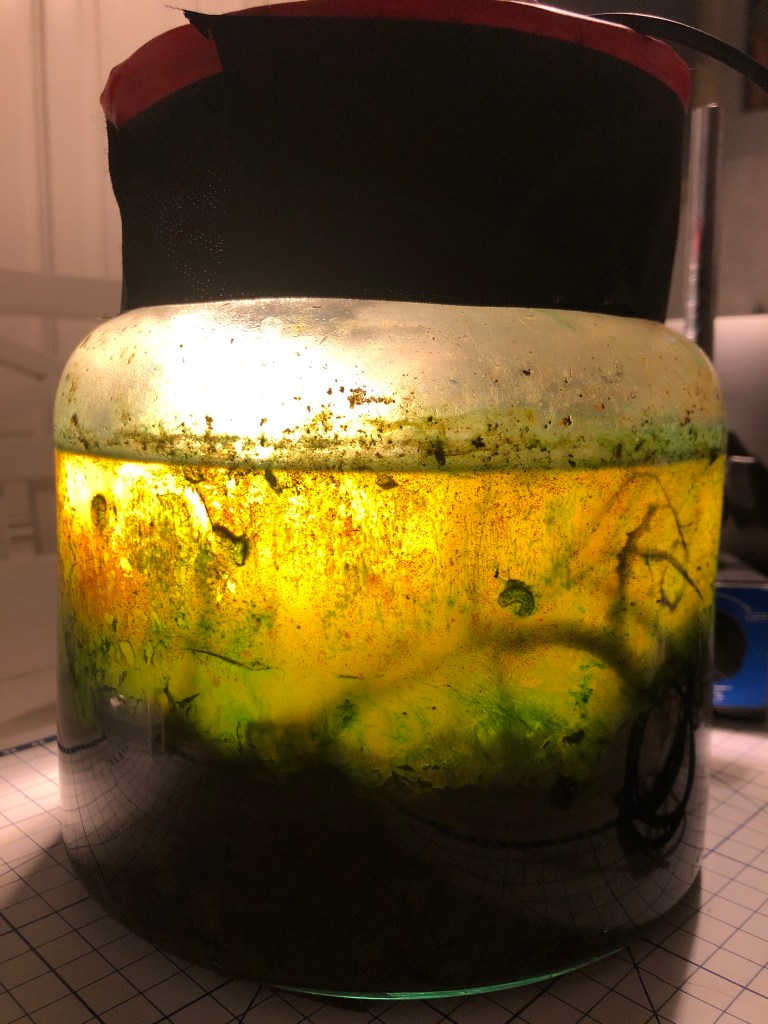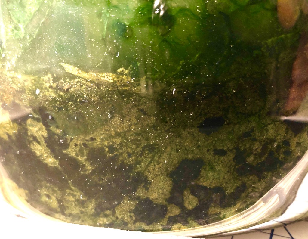 The swamp is most insulting to the nostrils. Became blurry with algae both on the jar walls and within the mass of the water. Large 8-10mm larvae jerking around on the surface. Am expecting mosquitoes which will be killed.