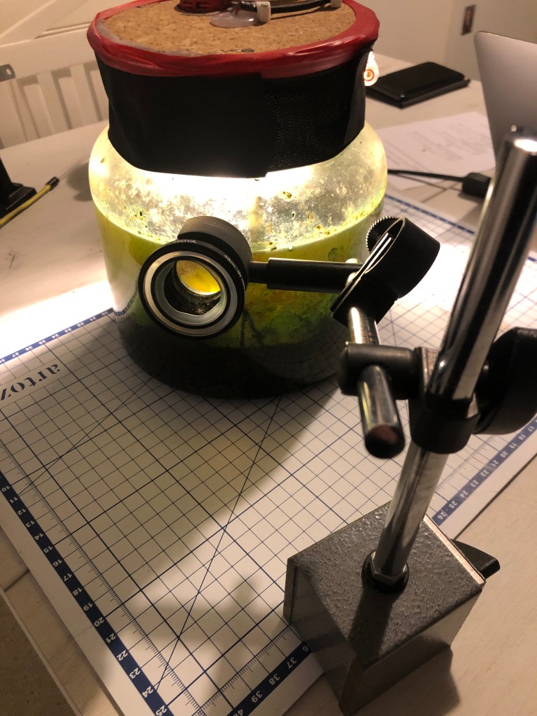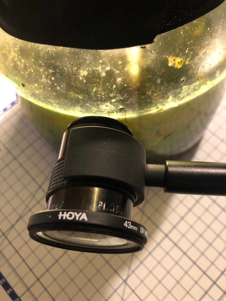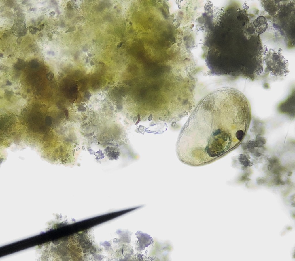 There is no sight of the snail or the bubble bugs. There is no movement that can be seen with the unaided eye. Using a 25mm eyepiece for astrophotography as a loupe allowed me to see the larger protozoa swimming around the jar, so they managed to survive and reproduce. It would be interesting to know how many generations have spawned since I collected the sample.