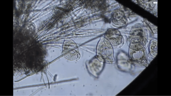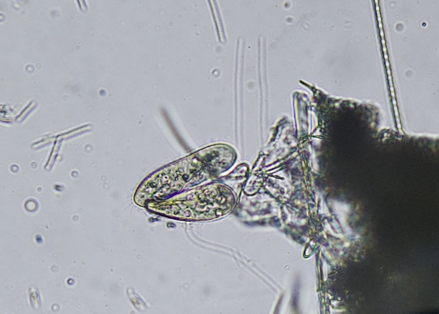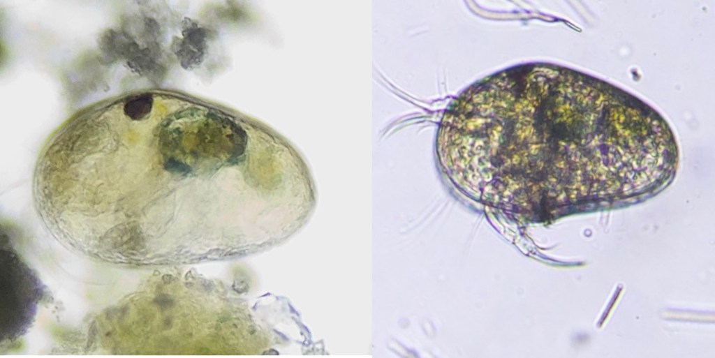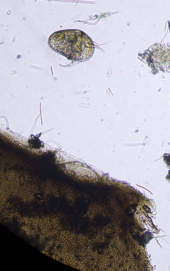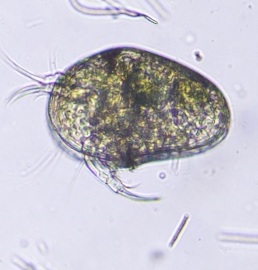 The most abundant micro-organism is a species of ostracod. This is a fresh water crustacean that lives inside a clam-like structure composed of two valves articulated on the dorsal side that swims around by agitating its antennae and claw-like appendages. Judging by their numbers, the Swamp contains no predators for this creature.
