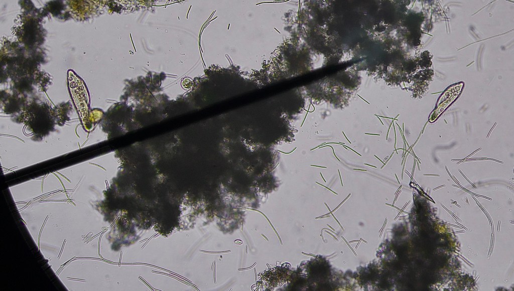 Saw some flat worms, small, maybe 5mm, many nematodes twirling about. Some daphnia, but not a crowd. Cyclopes, as well. Many larvae, many dead. Saw what looked like a small 2-3mm fly or mosquito hatching from one on a leaf on the surface. All mosquitoes will be killed. I also saw what I believe are carnivorous oligochaete worms. Many ciliates.