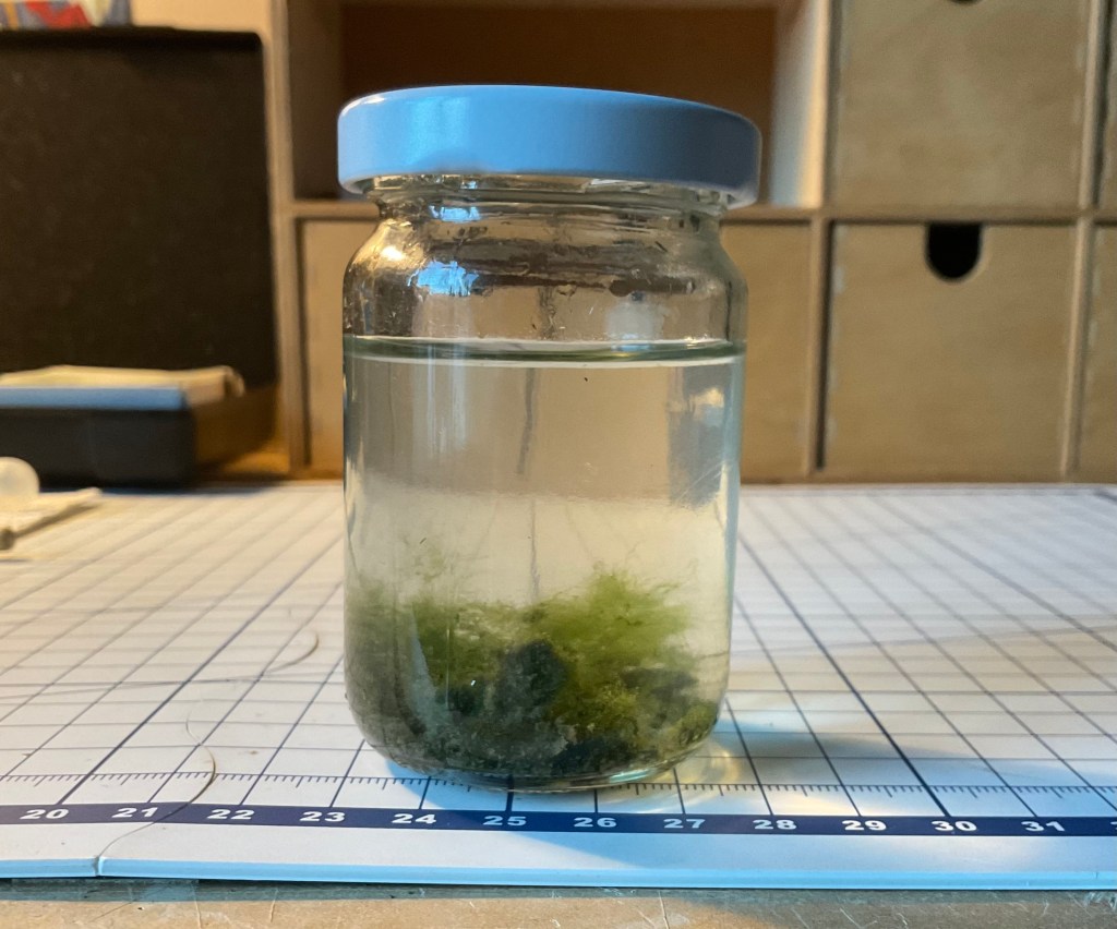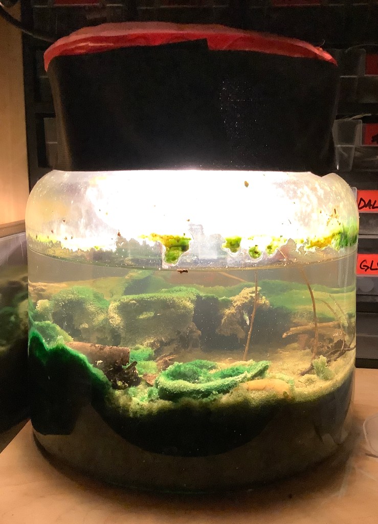 The walls of the jar have became almost opaque with the algae growing on them. Some are long filaments that seem to be growing on the walls, in the body of water and above the water line. There is also a much smaller variety, that sticks to the walls and makes a fine, green film. The substrate is black mud and pebbles; it seems to be partially colonised by a lighter coloured algae-type organism. Will have to check in more detail.