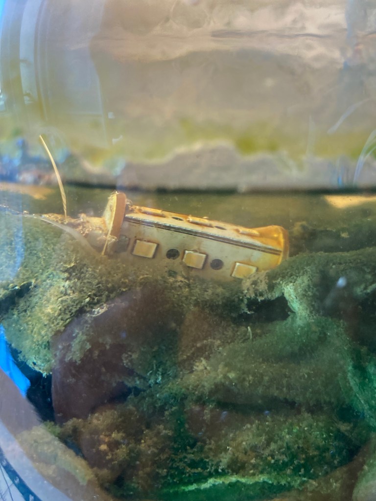 Only one plant seems to have survived. It’s a long thin blade of grass that produced a very nice root that eventually found the bottom. this seems to be surviving and has risen well beyond the surface – it’s flat against the top.