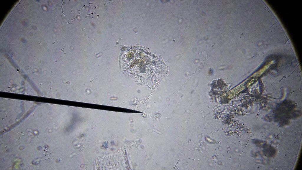 The only rotifer I found. It was not feeding and I only saw it moving about. They used to be the dominant kind of micro-organism for the first 6 months or so.