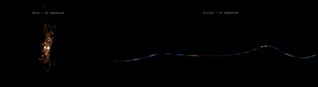 Expose for 2-3s and gently tap on your camera to induce movement and get a line on the photo, rather than a dot. Light from planets will be monochrome (Mars is a good target, because it’s nice and red), whereas light from a star will pass through all the colours of the rainbow as it’s distorted by the atmosphere.