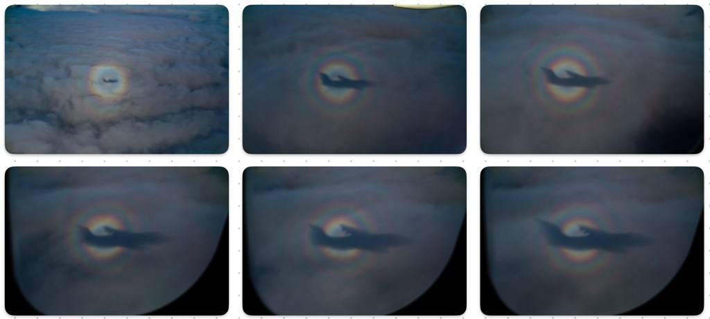 Interesting to notice that as the plane descends for landing its shadow gets bigger but the glory diameter remains the same.