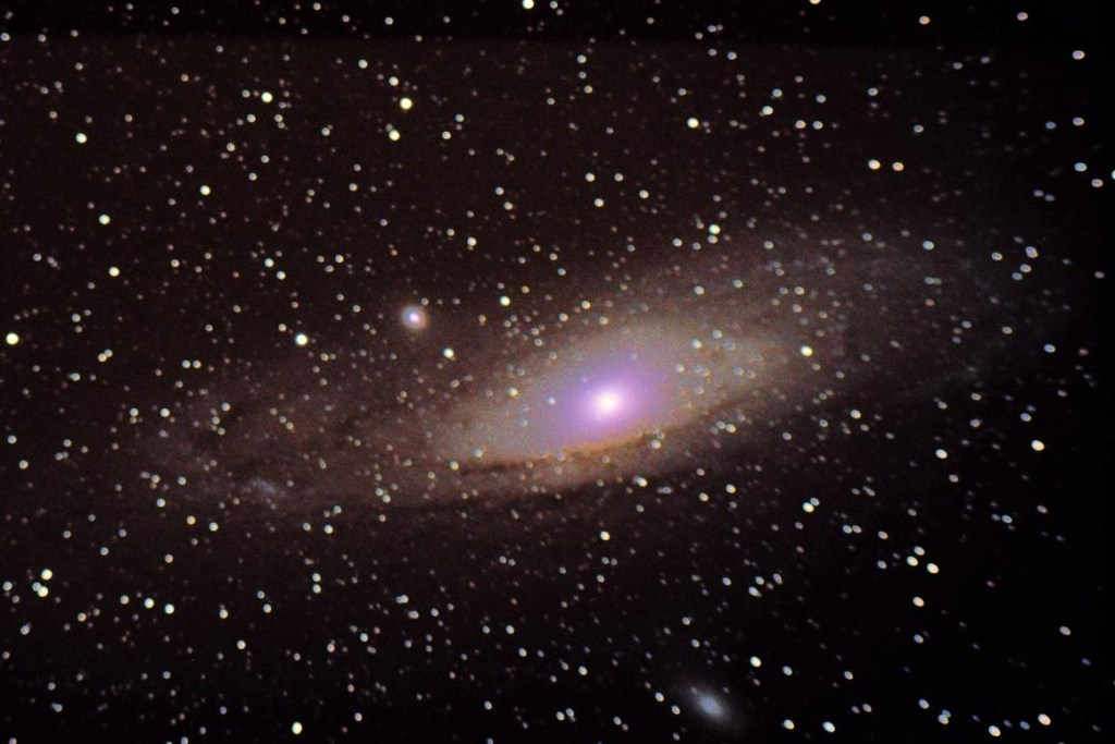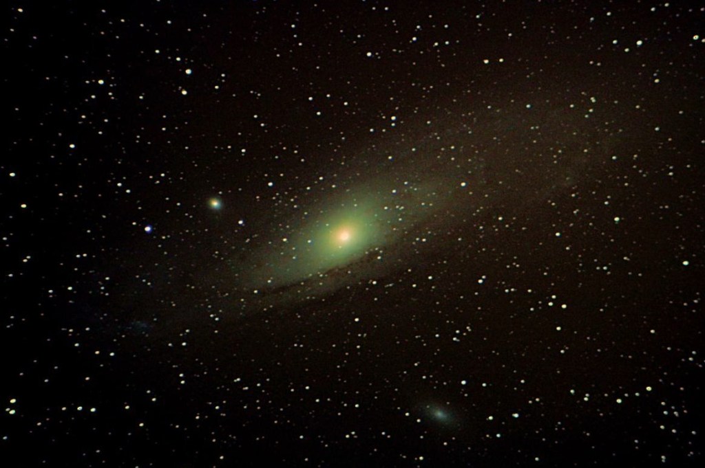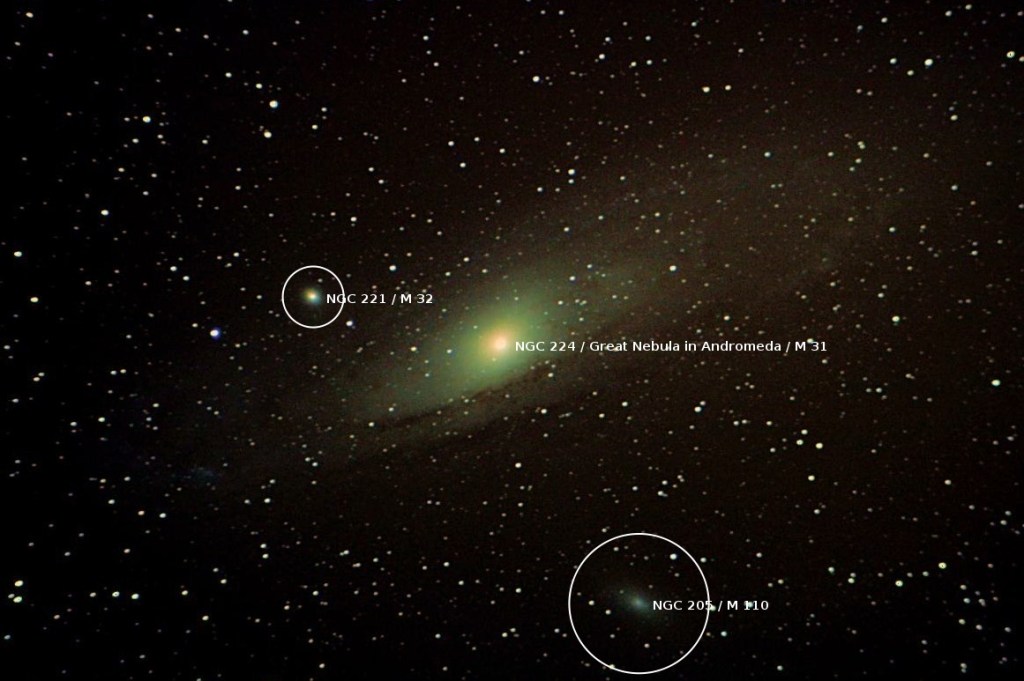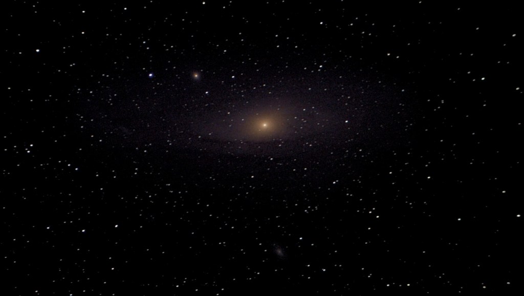 The great galaxy in Andromeda shines at mag 3.4, which is very bright. It is visible even in light polluted areas, and is the farthest galaxy that can be seen with the naked eye. It takes 2.5 million years for its light to reach us.