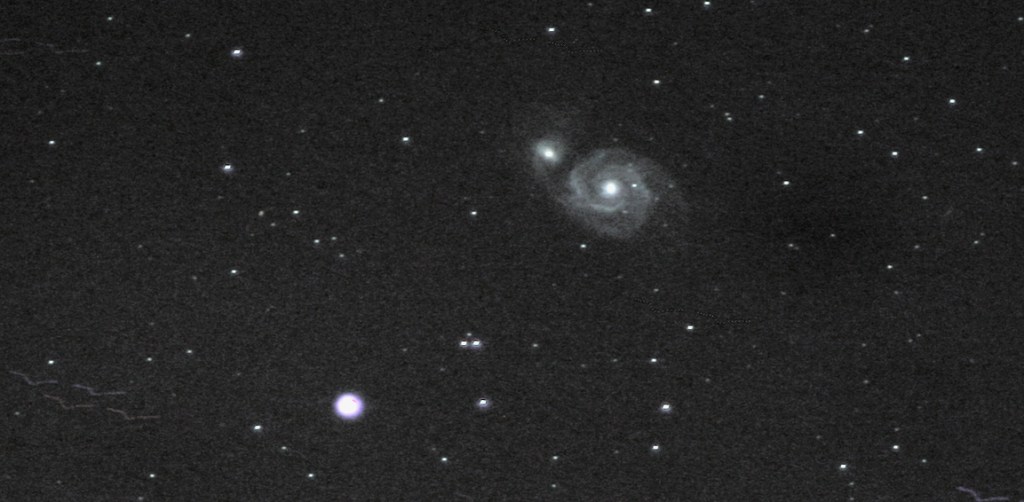 M51 shines at mag 8.4 (decently bright) and spans 11 arc-minutes by 7 arc-minutes (rather large as far as galaxies go). The photos show M51 as it was 30 million years ago, which is the time it took for light to reach us.